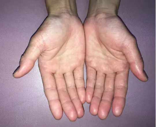 私は手の皮膚の抵抗力が無いと考え、手にいく神経はどこからなのか、また、そこはなぜズレたのかを説明し、ズレを治すと変化しました。
