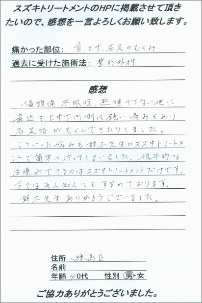 偏頭痛、不眠症、熟睡できない他に最近はヒザ下内側に痛みもあり右足指がむくんできたりしました。こういった悩みも鈴木先生のスズキトリートメントで簡単に治ってしまいました。根本的な治療ができるのはスズキトリートメントだけです。今では友人知人にもすすめております。鈴木先生ありがとうございました。