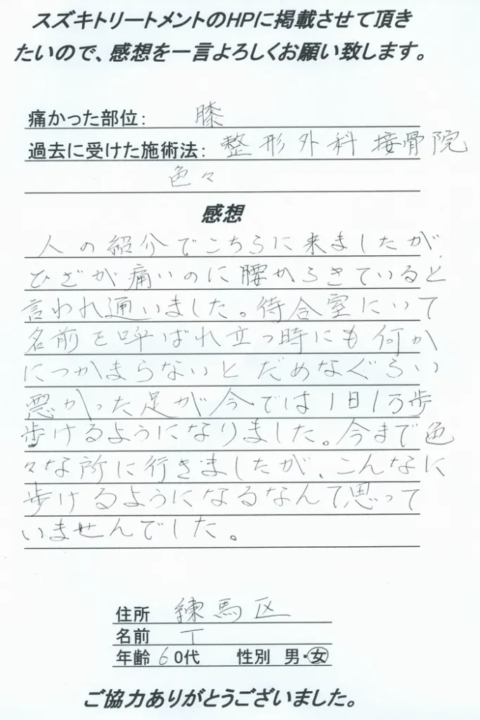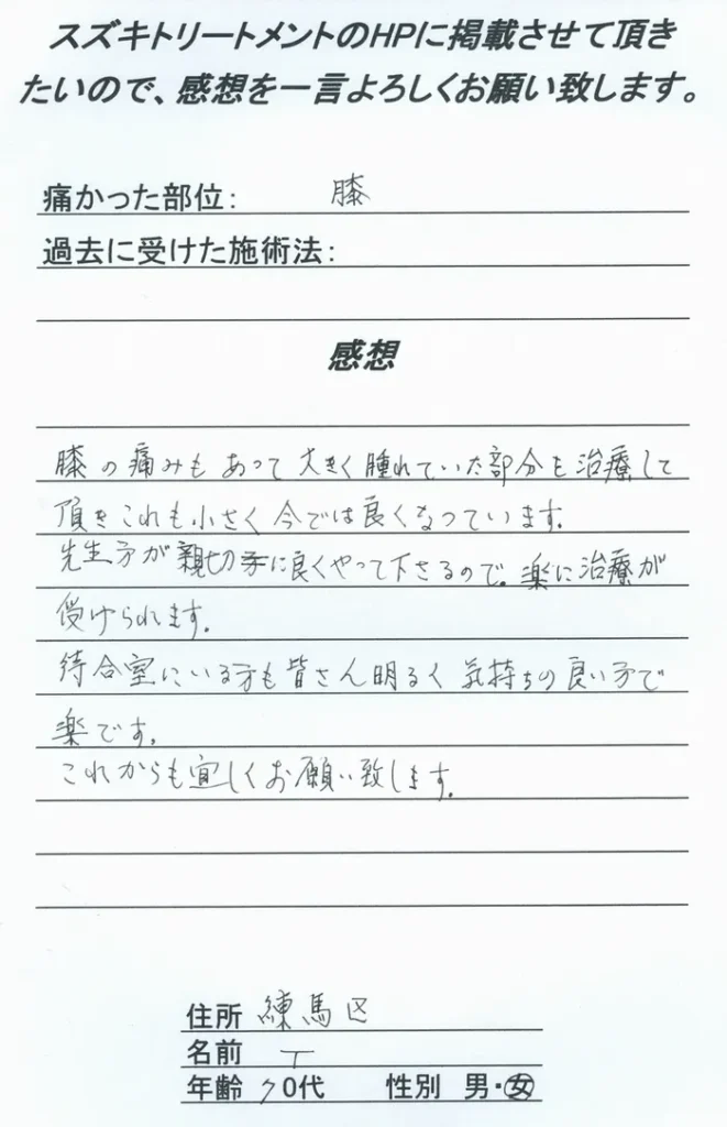 膝の痛みもあって大きく腫れていた部分を治療して頂きこれも小さく今では良くなっています。先生方が親切によくやってくださるので、楽に治療が受けられます。待合室にいる方も皆さん明るく気持ちの良い方で楽です。これからも宜しくお願いいたします。